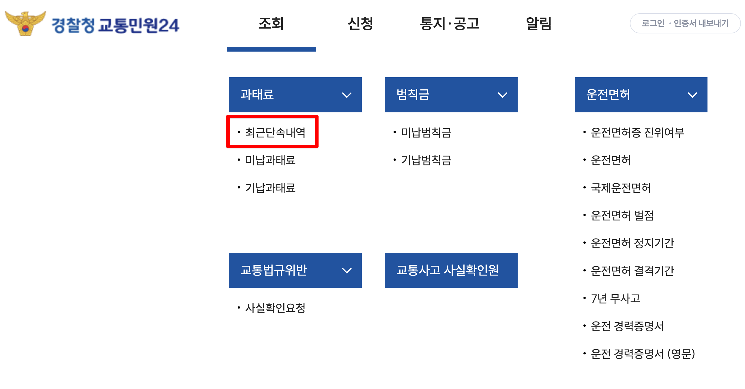 [ 경찰청교통민원24 홈페이지 접속 > 조회 > 과태료 > 최근단속내역 > 확인 ]