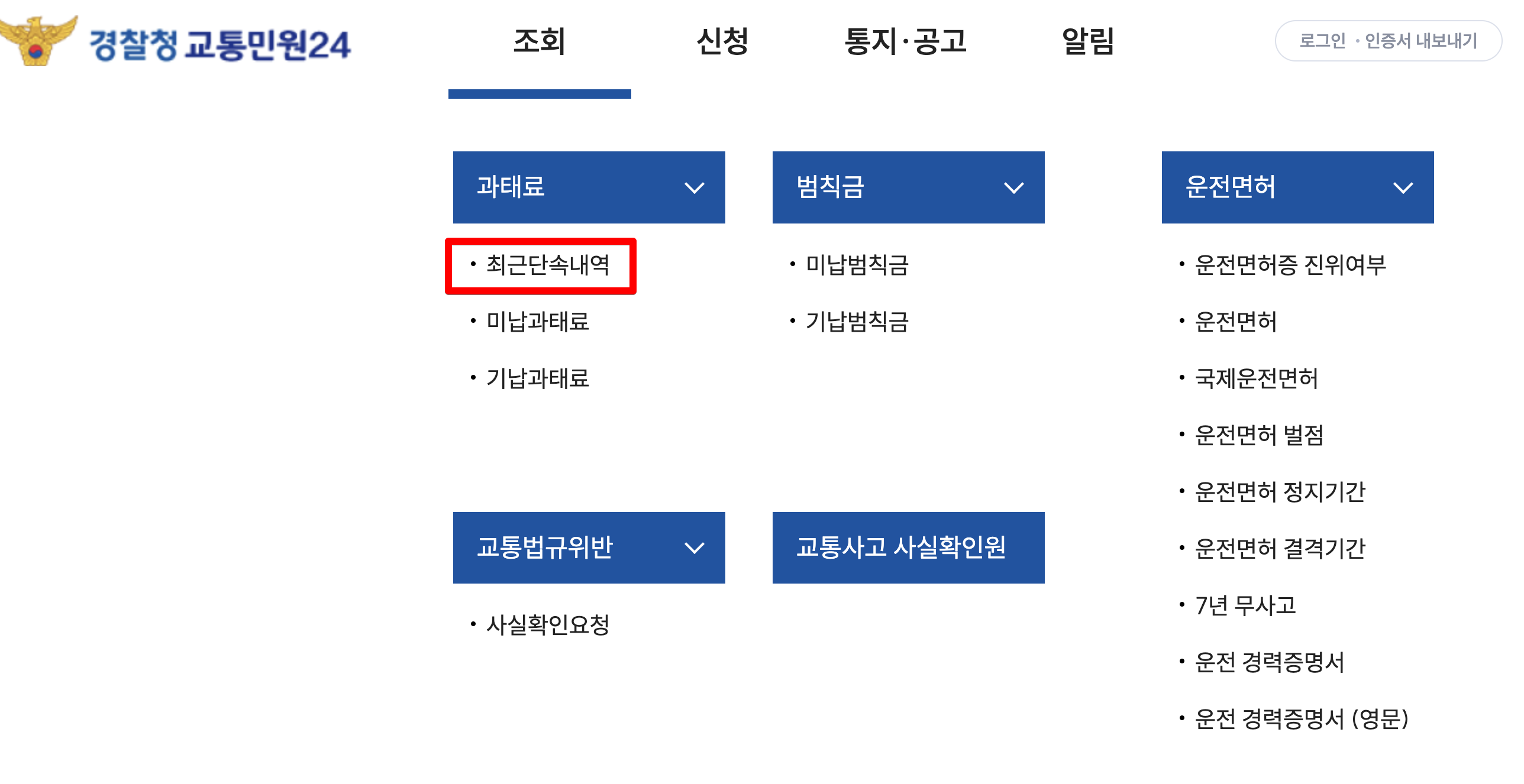 [ 경찰청교통민원 24 접속 > 조회 > 과태료 > 최근단속내역 > 확인 ]