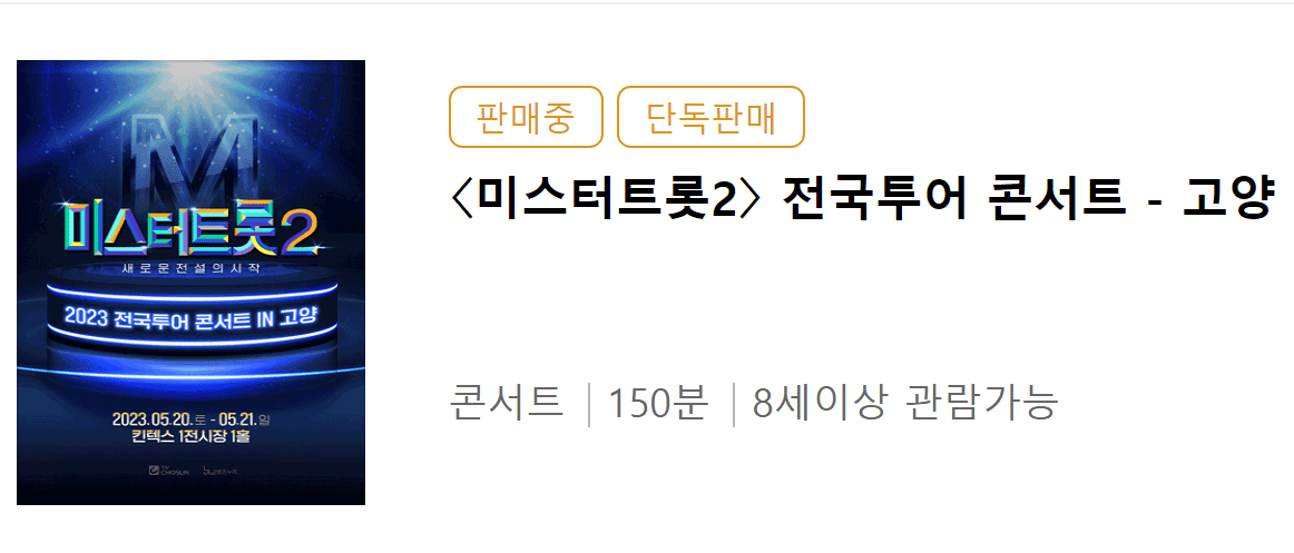 미스터트롯2의 전국 투어 콘서트가 이제 코 앞으로 다가왔습니다. 서울에서만 하는 거 아니냐고요? 당연히 이름 그대로 전국투어기 때문에 전국적으로 콘서트 계획이 있습니다. 서울 콘서트를 놓치신 분들은 지금 딱 집중하셔서 2023년 5월 20일부터 5월 21일까지 하는 미스터트롯2 고양 콘서트 예매에 성공하세요. 일단 예매 먼저 하고 편하게 포스팅 즐기세요.