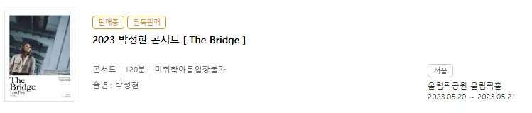 오늘은 박정현 콘서트 예매, 전국투어 정보에 대해서 자세히 소개하겠습니다. 박정현은 5월 20일과 21일 양일 간 서울 올림픽 올림픽홀에서 2023 박정현 콘서트 'The Bridge(더브리지)'를 개최하고 본격적인 전국투어를 시작한다고 합니다. 아시죠? 잔여티켓이 얼마 없다고 합니다. 지금 바로 예매하고 마음편히 콘서트 정보를 확인해 보세요.