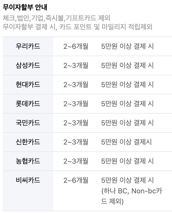 그래도 부담스러우실까 봐 무이자 할부 정보도 챙겨 왔어요.