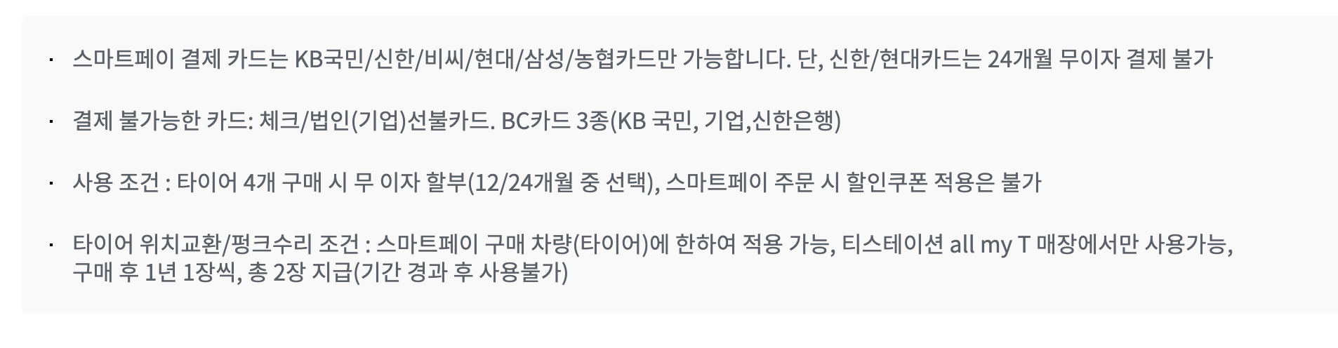 3. 원하시는 타이어를 고르신 후 결제 시 "스마트페이"로 결제를 진행하시면 됩니다.