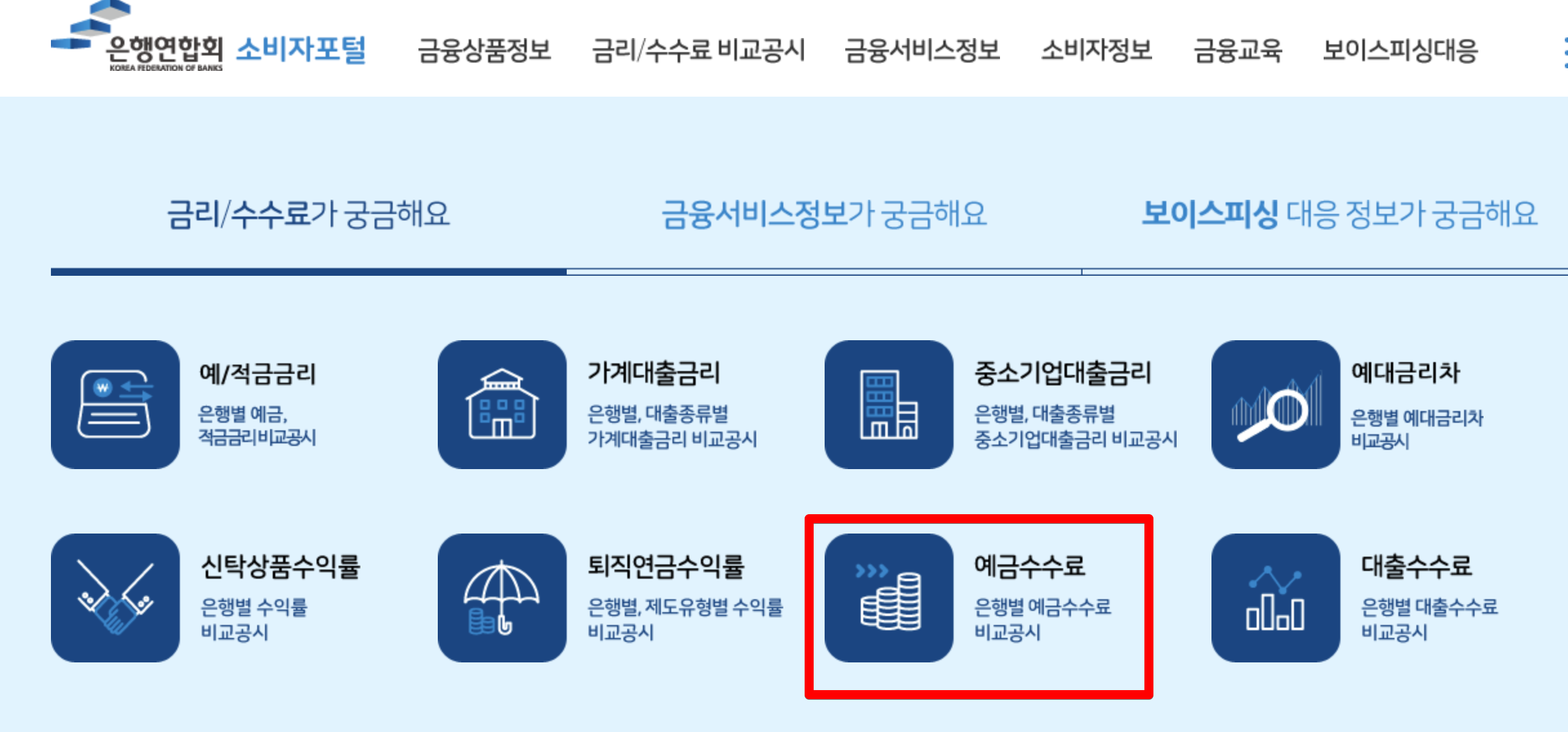 1. 다시 홈페이지로 이동하세요. 아래와 같이 "예금수수료"를 선택하세요.