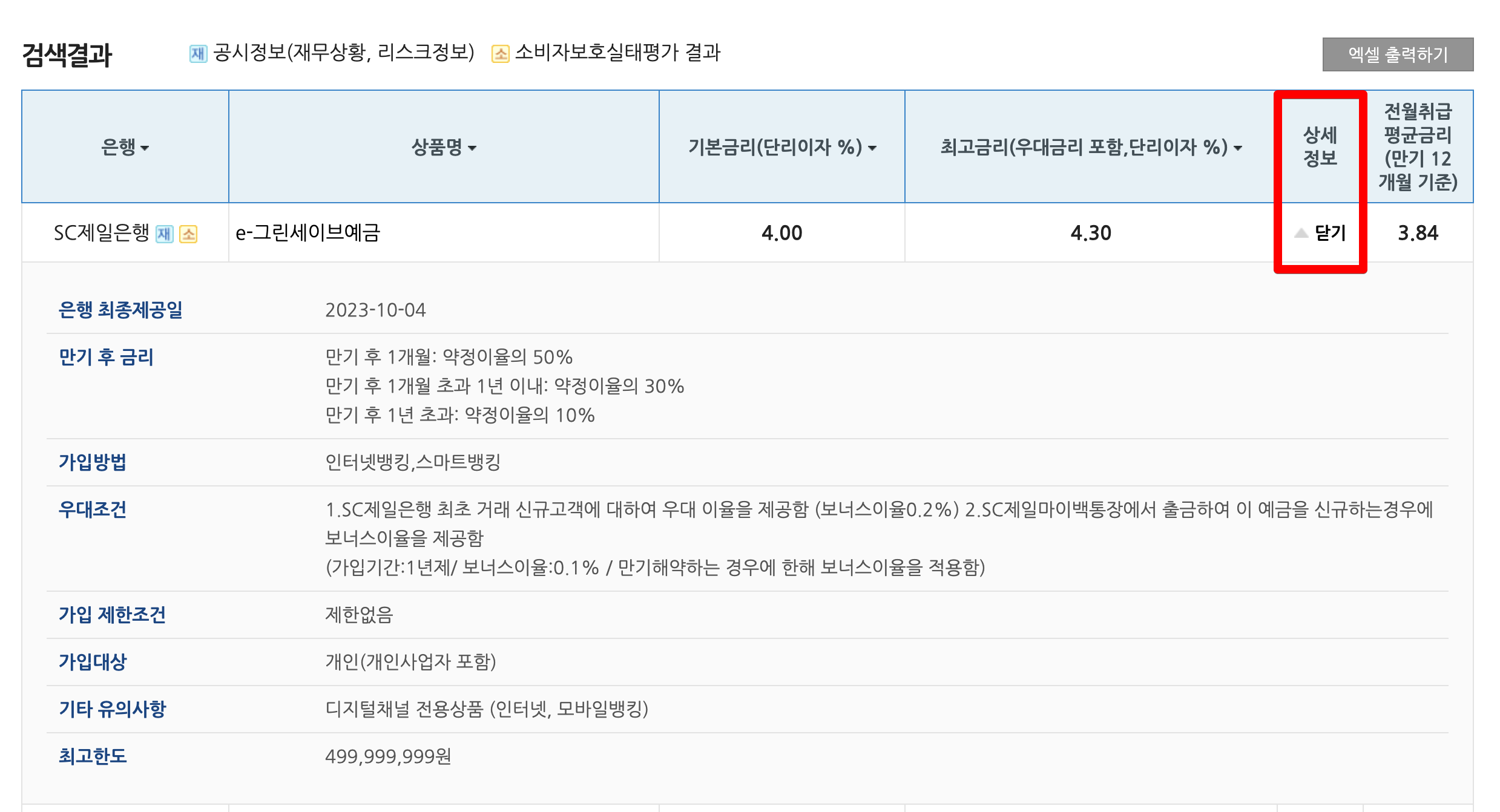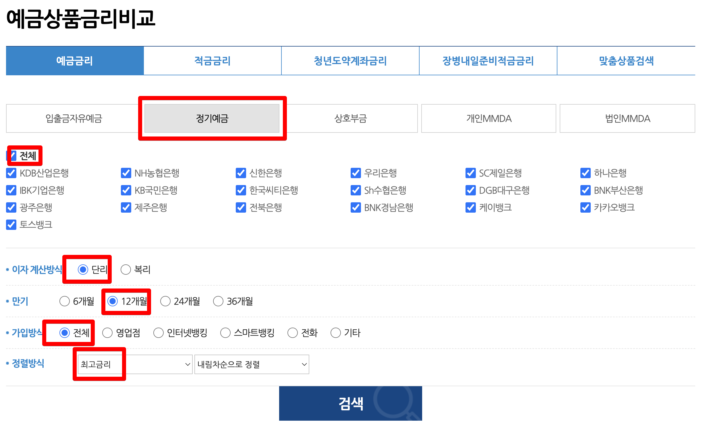 * 정렬방식에서 "내림차순"으로 하셔야 최고금리부터 순서대로 조회가 됩니다.
